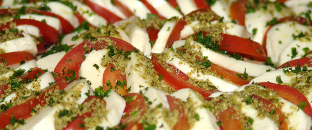 * Tomate - Mozzarella mit frischem Basilikum, Balsamico und Olivenöl